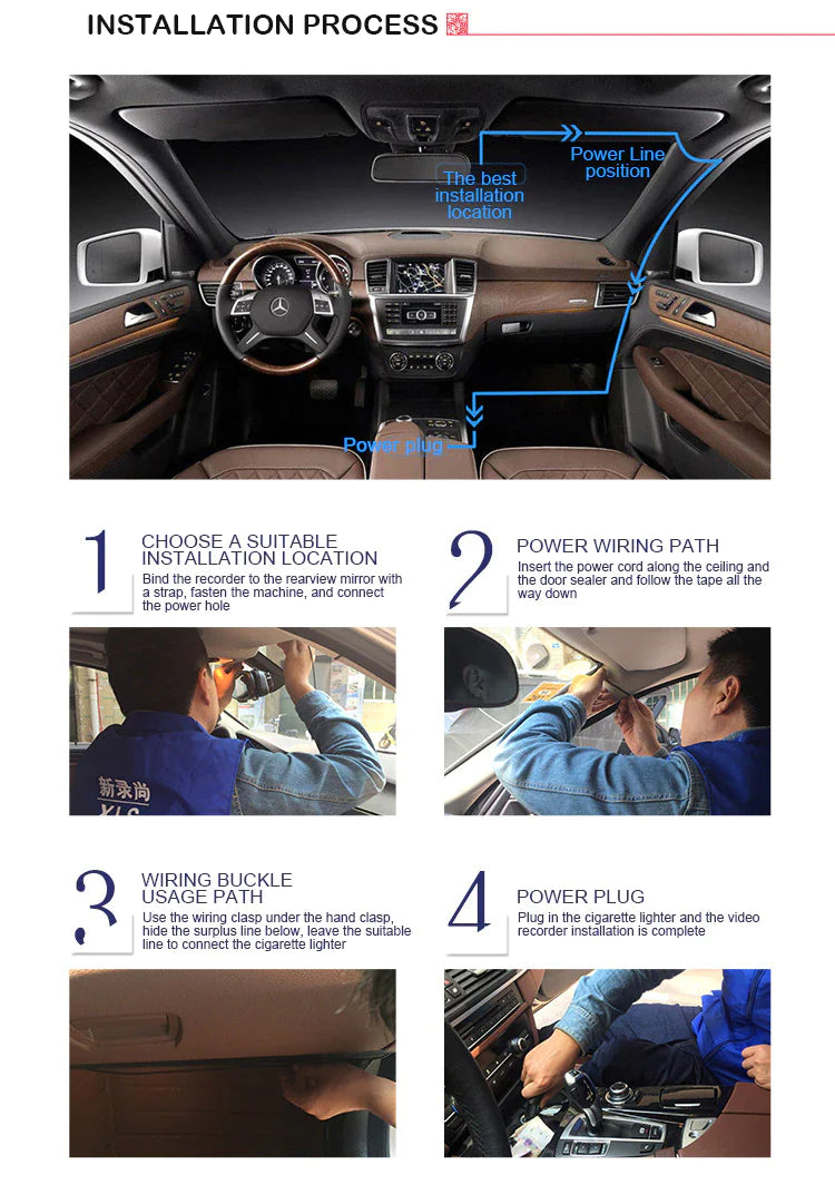 This dash camera is very easy to install and operate with reference pictures in our user manual. The included suction mount could be easily attached anywhere on your windshield in seconds. Just plug in the SD card (not included) and connect to the power supply. The car dash camera will start recording immediately after igniting, shut down and save the video when you shut off the engine.